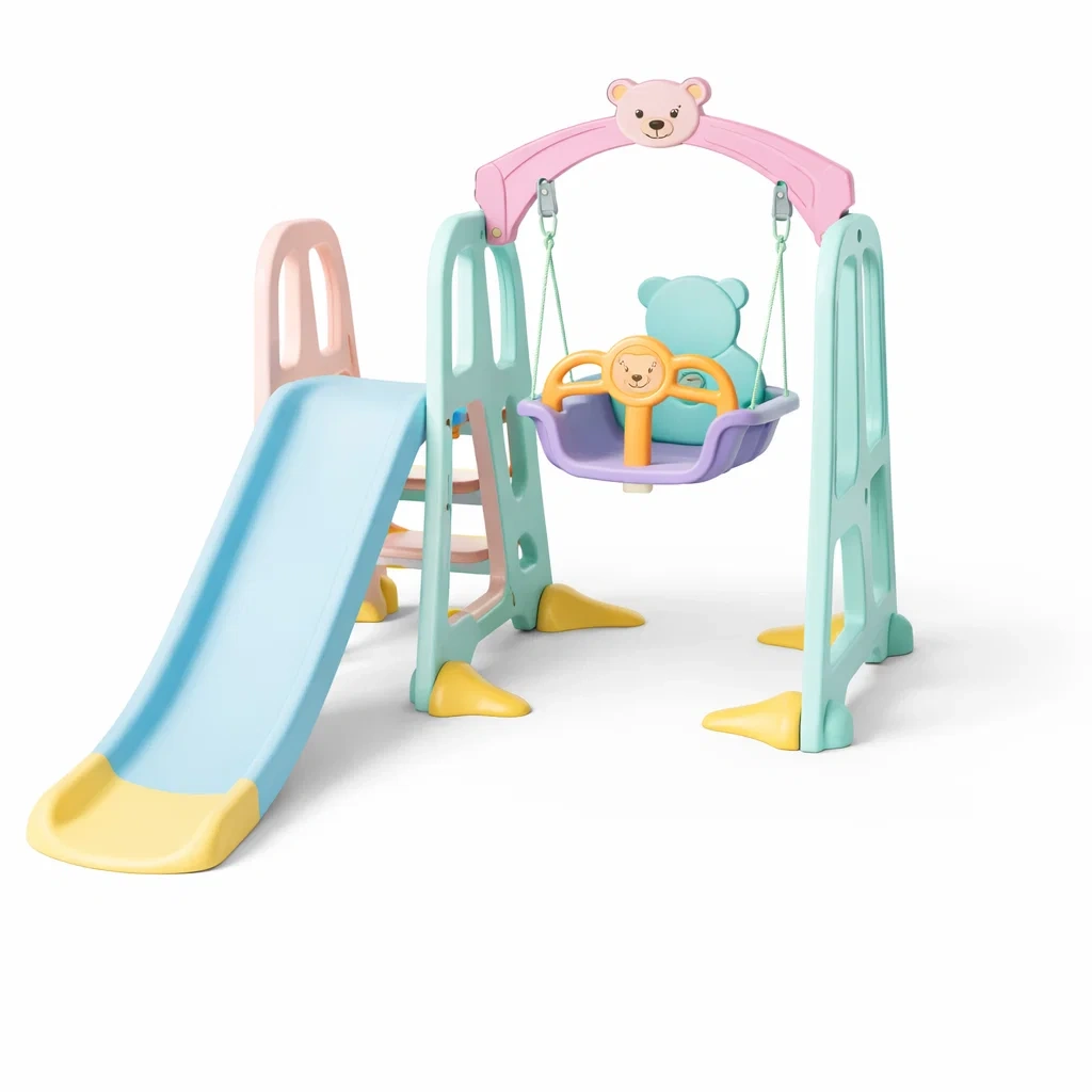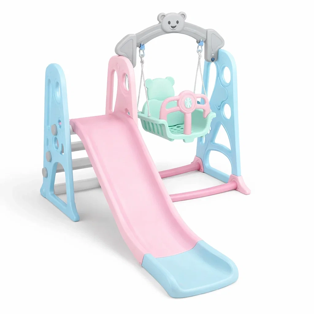 Attrezzatura da gioco per bambini con scivolo e altalena in plastica rosa e azzurro