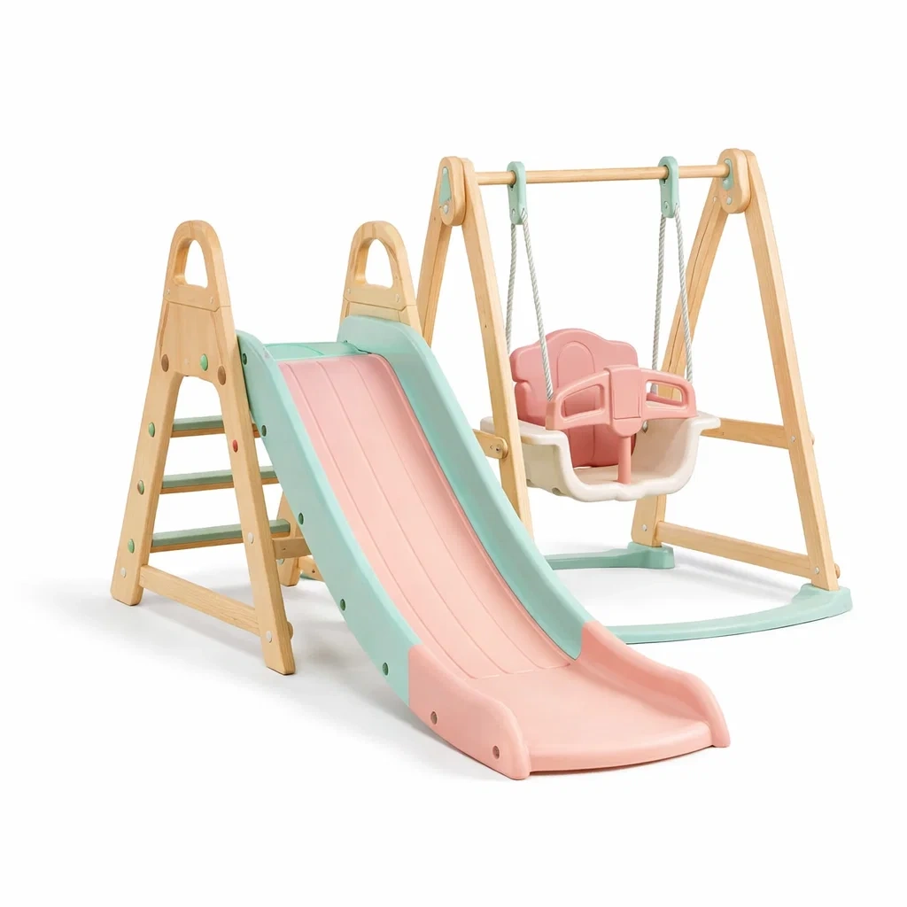 Attrezzatura da gioco per bambini con scivolo e altalena in plastica rosa e menta con struttura in legno