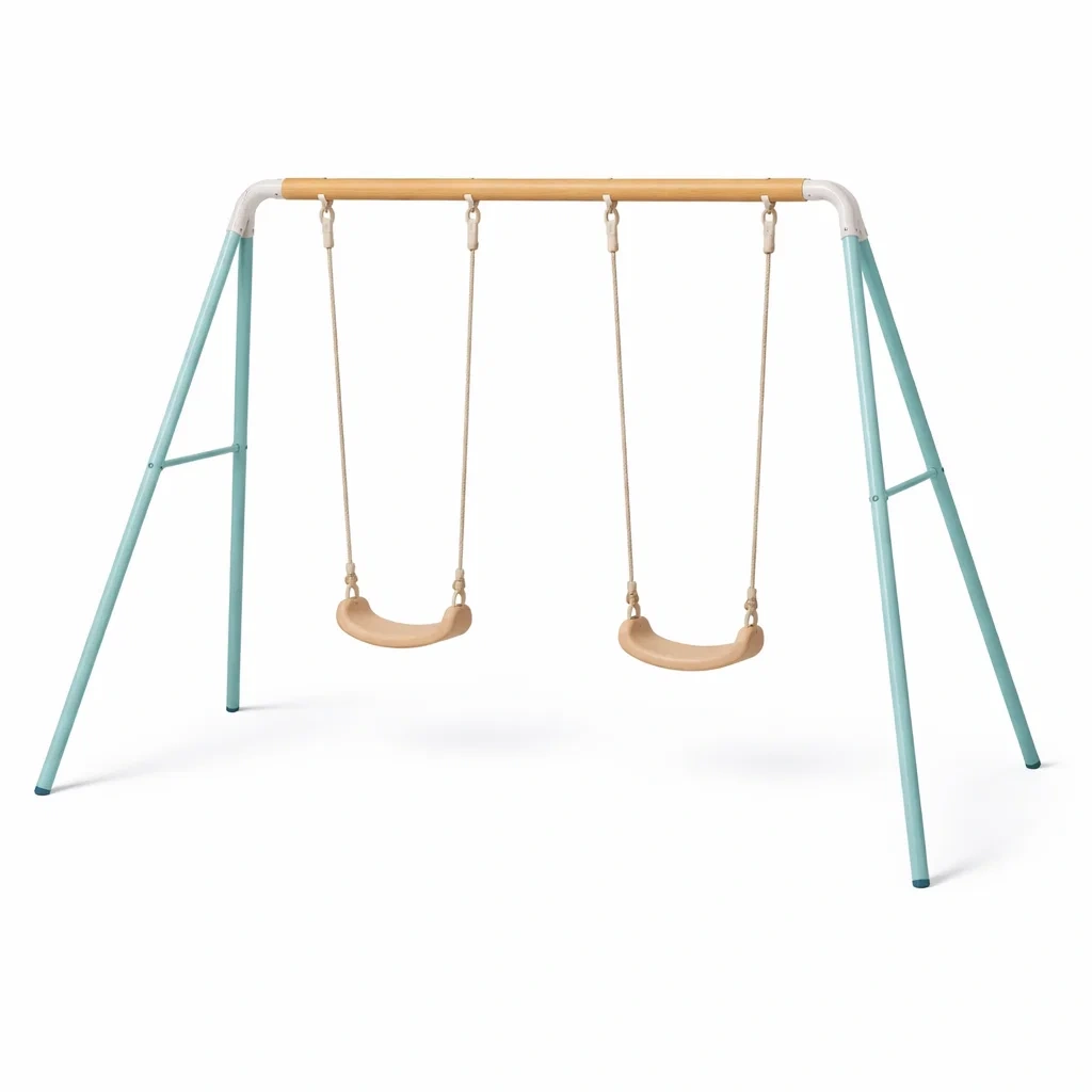 Struttura in metallo, barra superiore in legno, sedili in plastica e corde in nylon.